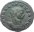 ID C46: Aurelianus AD 270-275 Antoninianus (BI; 18-21mm; 2.57g; 2h) Rome, 1st issue, 3rd officina, Oct – Dec 270. IMP C L DO[M A]VRE]LIANVS AVG Radiate, cuirassed and draped bust of Aurelianus to right. Rev. VIC[TOR]IA AVG Victoria running to right, holding wreath in right hand and palm branch over left shoulder; in the field to right, Γ. Details |