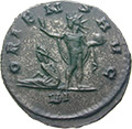 ID C30: Aurelianus AD 270-275 Antoninianus (BI; 17-20mm; 1.87g; 6h) Mediolanum (Milan), 4th issue, 1st officina, end 272 – 273-early 274. [IMP AVRE]LIANVS AVG Radiate, cuirassed bust of Aurelian to right. Rev. RES[TITVT O]RBIS Female figure standing to right, crowning Emperor in military dress standing left, holding spear in left hand; in exergue, P (?). Details |