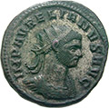 ID C46: Aurelianus AD 270-275 Antoninianus (BI; 18-21mm; 2.57g; 2h) Rome, 1st issue, 3rd officina, Oct – Dec 270. IMP C L DO[M A]VRE]LIANVS AVG Radiate, cuirassed and draped bust of Aurelianus to right. Rev. VIC[TOR]IA AVG Victoria running to right, holding wreath in right hand and palm branch over left shoulder; in the field to right, Γ. Details |