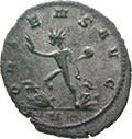 ID C42: Aurelianus AD 270-275 Antoninianus (BI; 20-23mm; 3.60g; 12h) Ticinum, 3rd issue, 4th officina, October 274. IMP C AVRELIANVS AVG Radiate and cuirassed bust of Aurelian to right. Rev. SOLI - INVICTO Sol standing to left, with right hand raised and holding globe in left hand, right foot resting on a bound captive in oriental dress seated left; on the other side, another bound captive in oriental dress seated to right, head turned left; in exergue, QXXT. Wonderful silvering. Details |