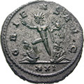 ID C46: Aurelianus AD 270-275 Antoninianus (BI; 18-21mm; 2.57g; 2h) Rome, 1st issue, 3rd officina, Oct – Dec 270. IMP C L DO[M A]VRE]LIANVS AVG Radiate, cuirassed and draped bust of Aurelianus to right. Rev. VIC[TOR]IA AVG Victoria running to right, holding wreath in right hand and palm branch over left shoulder; in the field to right, Γ. Details |