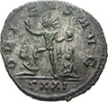 ID C46: Aurelianus AD 270-275 Antoninianus (BI; 18-21mm; 2.57g; 2h) Rome, 1st issue, 3rd officina, Oct – Dec 270. IMP C L DO[M A]VRE]LIANVS AVG Radiate, cuirassed and draped bust of Aurelianus to right. Rev. VIC[TOR]IA AVG Victoria running to right, holding wreath in right hand and palm branch over left shoulder; in the field to right, Γ. Details |