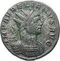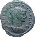 ID C01: Aurelianus AD 270-275 Antoninianus (BI; 22-23mm; 3.31g; 7h) Lugdunum (Lyon), 2nd issue, 3rd officina, end 274 - early 275. IMP C AVRELIANVS AVG Radiate and cuirassed bust of Aurelian to right. Rev. PACAT-O-R ORBIS Sol running to left, with right hand raised and holding whip in left hand, cloak flying behind; in exergue, C L. Details |