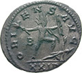ID C46: Aurelianus AD 270-275 Antoninianus (BI; 18-21mm; 2.57g; 2h) Rome, 1st issue, 3rd officina, Oct – Dec 270. IMP C L DO[M A]VRE]LIANVS AVG Radiate, cuirassed and draped bust of Aurelianus to right. Rev. VIC[TOR]IA AVG Victoria running to right, holding wreath in right hand and palm branch over left shoulder; in the field to right, Γ. Details |