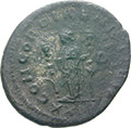 ID C46: Aurelianus AD 270-275 Antoninianus (BI; 18-21mm; 2.57g; 2h) Rome, 1st issue, 3rd officina, Oct – Dec 270. IMP C L DO[M A]VRE]LIANVS AVG Radiate, cuirassed and draped bust of Aurelianus to right. Rev. VIC[TOR]IA AVG Victoria running to right, holding wreath in right hand and palm branch over left shoulder; in the field to right, Γ. Details |