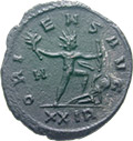 ID C46: Aurelianus AD 270-275 Antoninianus (BI; 18-21mm; 2.57g; 2h) Rome, 1st issue, 3rd officina, Oct – Dec 270. IMP C L DO[M A]VRE]LIANVS AVG Radiate, cuirassed and draped bust of Aurelianus to right. Rev. VIC[TOR]IA AVG Victoria running to right, holding wreath in right hand and palm branch over left shoulder; in the field to right, Γ. Details |
