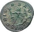 ID C46: Aurelianus AD 270-275 Antoninianus (BI; 18-21mm; 2.57g; 2h) Rome, 1st issue, 3rd officina, Oct – Dec 270. IMP C L DO[M A]VRE]LIANVS AVG Radiate, cuirassed and draped bust of Aurelianus to right. Rev. VIC[TOR]IA AVG Victoria running to right, holding wreath in right hand and palm branch over left shoulder; in the field to right, Γ. Details |