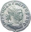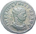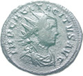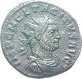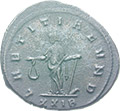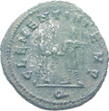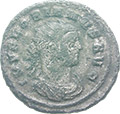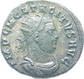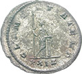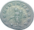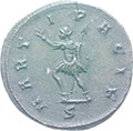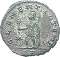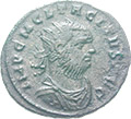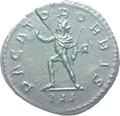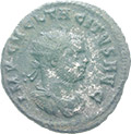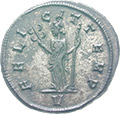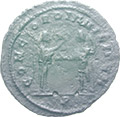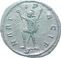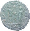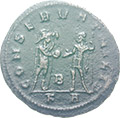 ID D46: Florianus AD 276 Antoninianus (BI; 22-23mm; 3.11g; 7h) Lugdunum (Lyon), 2nd issue, 3rd officina, July 276. IMP C M AN FLORIANVS P F AVG Radiate, cuirassed and draped bust of Florianus to right. Rev. PACATOR ORBIS Sol running to left, with right hand raised and holding whip in left hand, cloak flying behind; in exergue, III. Details |