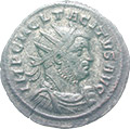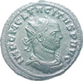 ID D06: Tacitus AD 275-276 Antoninianus (BI; 21-24mm; 3.45g; 6h) Lugdunum (Lyon), 5th issue, 1st officina, March - April 276. IMP CL TACITVS AVG Radiate, cuirassed and draped bust of Tacitus to right. Rev. TEMPORVM FELICITAS Felicitas standing to left, holding long-handled caduceus in right hand and cornucopiae in left hand; in the field, A – A. Details |