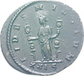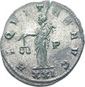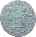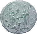 ID D47: Florianus AD 276 Antoninianus (BI; 19-22mm; 3.40g; 7h) Rome, 1st issue, 2nd officina, Jul – Aug 276. IMP C FLORIANVS AVG Radiate, cuirassed and draped bust of Florianus to right, seen from the rear. Rev. LAETITIA FVND Laetitia standing to left, holding wreath in right hand and anchor in left hand; in exergue, XXIB. Details |