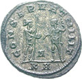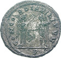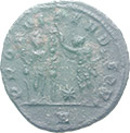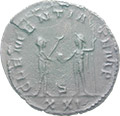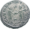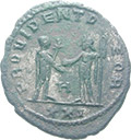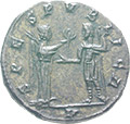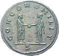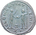 ID D50: Florianus AD 276 Antoninianus (BI; 22-24mm; 3.01g; 11h) Cyzicus, 1st issue, 1st officina, Jul - Aug 276. IMP FLORIANVS AVG Radiate, cuirassed and draped of Florianus to right. Rev. CONC-ORDIA MILITVM Victory standing to right, holding wreath in right hand and palm against left shoulder, facing Emperor in military dress standing to left, right hand outstretched and holding long sceptre in left hand; in exertgue, P. Details |