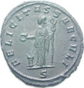 ID D27: Tacitus AD 275-276 Antoninianus (BI; 22mm; 3.78g; 6h) Siscia, 5th issue, 5th officina, early – June 276. IMP C M CL TACITVS AVG Radiate, cuirassed and draped bust of Tacitus to right. Rev. FELICITAS S-AECVLI Felicitas standing to left, holding patera over small altar in right hand and long-handled caduceus in left hand; in exergue, V. Very rare. Details |
