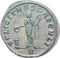 ID D28: Tacitus AD 275-276 Antoninianus (BI; 20-23mm; 4.03g; 12h) Siscia, 5th issue, 6th officina, early – Jun 276. IMP C M CL TACITVS AVG Radiate and cuirassed bust of Tacitus to right. Rev. PAX - AVGVSTI Pax running to left, holding olive branch in right hand and long transverse sceptre in left hand; in exergue, VI. Very rare. Details |