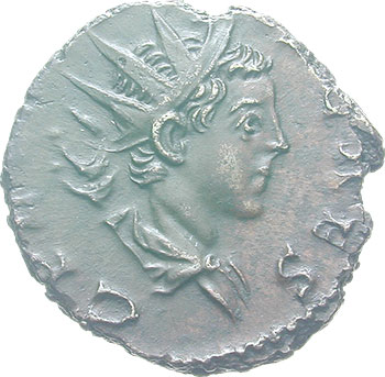 Tetricus II. AD 273-274 Antoninianus (AE, 16-18mm, 2.51g, 12h) Treveri (Trier), 4th issue, officina ‘C’ (ex Cologne), ca mid 272 – ca mid 273. C P [E TETRICVS] CAES Radiate, cuirassed and draped bust of Tetricus II to right, seen from the rear. Rev. PIETAS AVGG Sacrificial implements; from left to right: sprinkler, simpulum, jug (plain with handle right), knife and lituus.