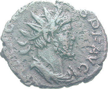 Tetricus I. AD 271-274 Hybrid Antoninianus (AE, 17-19mm, 1.95g, 7h) Treveri (Trier), 4th issue, ca mid 272 – ca mid 273. [IMP] C TE[TRICV]S P F AVG Radiate, cuirassed and draped bust of Tetricus to right. Rev. [PR]INC IV-VE[NT] Tetricus II, in military dress, standing to left, holding branch in right hand and long vertical sceptre in left hand.