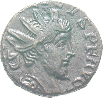 Radiatus Tetricus I (AE; 14-15mm; 2.28g; 7h) [ ]VS P F AVG TETRICVS [ ] Radiate and draped bust to right. Rev. [ ]IV-VE[ ] Tetricus II, in military dress, standing to left, holding branch in right hand and long vertical sceptre in left hand.