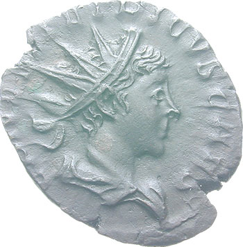 Tetricus II. AD 273-274 Antoninianus (AE, 17-20mm, 2.72g, 6h) Treveri (Trier), 5th issue, ca late 273. C PIV ESV TETRICVS CAES Radiate and draped bust of Tetricus II to right, seen from rear. Rev. [SPE]S - AVGG Spes advancing to left, holding flower in right hand and raising skirt with left hand; only one leg visible through her skirt.