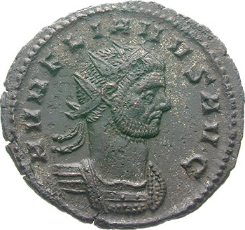 Aurelianus AD 270-275 Antoninianus (BI; 21-22mm; 4,10g; 12h) Rome, 6th issue, 2nd phase, 5th officina, end 273 – early 274. AVRELIANVS AVG Radiate and cuirassed bust of Aurelian to right. Rev. ORI-EN-S A-VG Sol standing to left, right hand raised and holding globe in left hand; at feet to left, bound captive in oriental dress seated; in exergue, V.