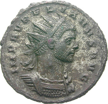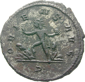 Aurelianus AD 270-275 Antoninianus (BI; 22-23mm; 4.16g; 12h) Rome, 7th issue, 1st officina, spring 274. IMP AVRELIANVS AVG Radiate and cuirassed bust of Aurelian to right. Rev. ORI-E-NS AVG Sol standing to left, right hand raised and holding globe in left hand, right foot resting on a bound captive in oriental dress seated to left; on the other side, another bound captive in oriental dress seated to right, head turned left; in exergue, P.