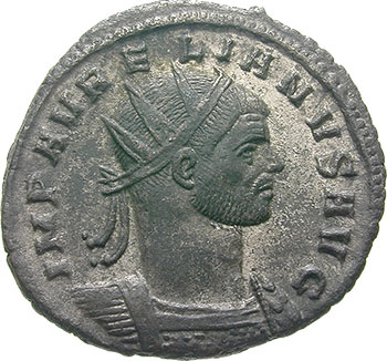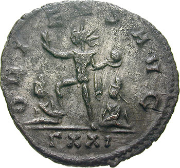 Aurelianus 270-275 Antoninianus (BI; 21-22mm; 3.90g; 6h) Rome, 9th issue, 3rd officina, summer – autumn 274. IMP AV-R-ELIANVS AVG Radiate and cuirassed bust of Aurelianus to right. Rev. ORI-E-NS AVG Sol standing to left, right hand raised and globe in left; right foot resting on a bound captive in oriental dress seated to left on left side; opposite side another bound captive in oriental dress seated to right, head turned to left; in exergue, ΓXXI. Wonderful silvering.