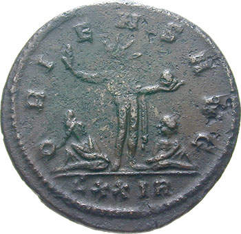Aurelianus AD 270-275 Antoninianus (BI; 22mm; 4.24g; 12h) Rome, 10th issue, 4th officina, end 274. IMP AVRELIANVS AVG Radiate, draped and cuirassed bust of Aurelianus to right. Rev. ORI-ENS AVG Sol standing to left, right hand raised, holding globe in left hand; at his feet, two captives seated; in exergue, ΔXXIR.