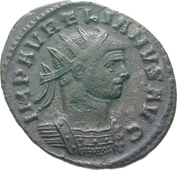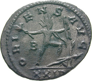 Aurelianus AD 270-275 Antoninianus (BI; 19-23mm; 3.09g; 12h) Rome, 11th issue, 2nd officina, early – Sept 275. IMP AVRELIANVS AVG Radiate and cuirassed bust of Aurelianus to right. Rev. ORI-ENS - AVG Sol walking to right, treading down enemy, in right hand branch, in left bow; in the field to left, B; in exergue, XXIR.