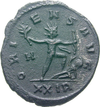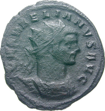 Aurelian AD 270-275 Antoninianus (BI; 21-23mm; 3.71g; 6h) Rome, 11th issue, 8th officina, early – Sept 275. IMP AVRELIANVS AVG Radiate and cuirassed bust of Aurelianus to right. Rev. ORI-ENS AVG Sol walking to right, treading down enemy, in right hand branch, in left bow; in the field to left, H; in exergue, XXIR.