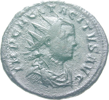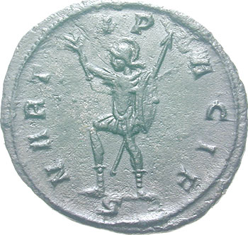 Tacitus AD 275-276 Antoninianus (BI; 21-22mm; 3.66g; 12h) Ticinum, 2nd issue, 2nd officina, early – Jun 276. IMP C M CL TACITVS AVG Radiate and cuirassed bust of Tacitus to right. Rev. MART-I P-ACIF Mars in military dress walking to left, holding olive branch in right hand, transverse spear and long oval shield in left hand; in exergue, S.
