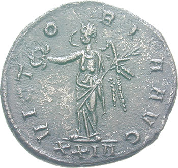 Tacitus AD 275-276 Antoninianus (BI; 21-22mm; 3.69g; 6h) Rome, 2nd issue, 1st officina, Nov – Dec 275. IMP C M CL TACITVS AVG Radiate, cuirassed and draped of Tacitus to right. Rev. VICT-O-RIA AVG Victory standing to left, holding wreath in right hand and palm against left shoulder, in exergue, XXIA.