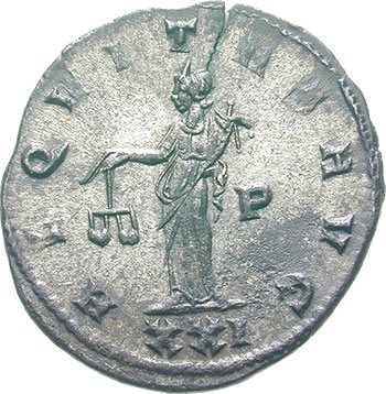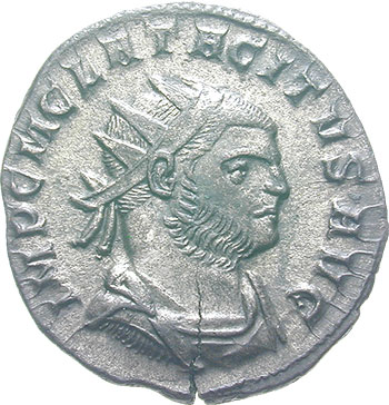 Tacitus AD 275-276 Antoninianus (BI; 21-23mm; 3.56g; 6h) Siscia, 1st issue, 1st officina, Nov - Dec 275. IMP C M CLA TACITVS AVG Radiate and cuirassed bust of Tacitus to right. Rev. AEQVITAS AVG Aequitas standing left, holding scales in right hand and cornucopiae in left; in the field to left, P; in exergue, XXI. Nice silvering. Extremely rare.