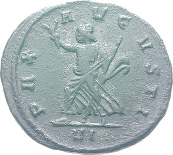 Tacitus AD 275-276 Antoninianus (BI; 20-23mm; 4.03g; 12h) Siscia, 5th issue, 6th officina, early – Jun 276. IMP C M CL TACITVS AVG Radiate and cuirassed bust of Tacitus to right. Rev. PAX - AVGVSTI Pax running to left, holding olive branch in right hand and long transverse sceptre in left hand; in exergue, VI. Very rare.