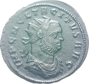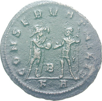 Tacitus AD 275-276 Antoninianus (BI; 22-24mm; 2.97g; 12h) Serdica, 2nd issue, 2nd officina, early 276. IMP C M CL TACITVS AVG Radiate, cuirassed and draped bust of Tacitus to right. Rev. CONSERVAT MILIT Mars in military dress standing to right, holding spear in left hand, giving globe to Emperor standing left, holding long sceptre in left hand; in the field, B; in exergue, KA.