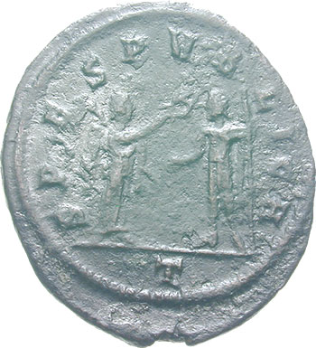 Tacitus AD 275-276 Antoninianus (BI; 22-25mm; 4.31g; 6h) Cyzicus, 3rd issue, 3rd officina, Jan – June 276. IMP C M CL TACITVS AVG Radiate, cuirassed and draped bust of Tacitus to right. Rev. SPES PVB-LICA Victory standing to right, holding wreath in right hand and palm against left shoulder, facing Emperor in military dress standing left, right hand outstretched and holding long sceptre in left hand; in exergue, T.