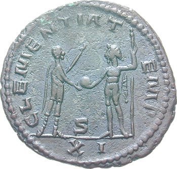Tacitus AD 275-276 Double Antoninianus (BI; 22-23mm; 4.43g; 11h) Antioch, 3rd issue, 6th officina, Jan – Jun 276. IMP C M CL TACITVS AVG Radiate, cuirassed and draped bust of Tacitus to right. Rev. CLEMENTIA T-EMP Emperor in military dress standing to right, holding short eagle-tipped sceptre in left hand, receiving globe from Jupiter standing left, holding long sceptre in left hand; in the field S; in exergue, XI. Extremely rare.