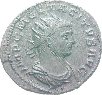Tacitus AD 275-276 Antoninianus (BI; 22-23mm; 3.25g; 5h) Antioch, 3rd issue, 6th officina, Jan – Jun 276. IMP C M CL TACITVS AVG Radiate, cuirassed and draped bust of Tacitus to right. Rev. CLEMENTIA - TEMP Emperor in military dress standing to right, holding short eagle-tipped sceptre in left hand, receiving globe from Jupiter standing left, holding long sceptre in left hand; in the field S; in exergue, XXI.